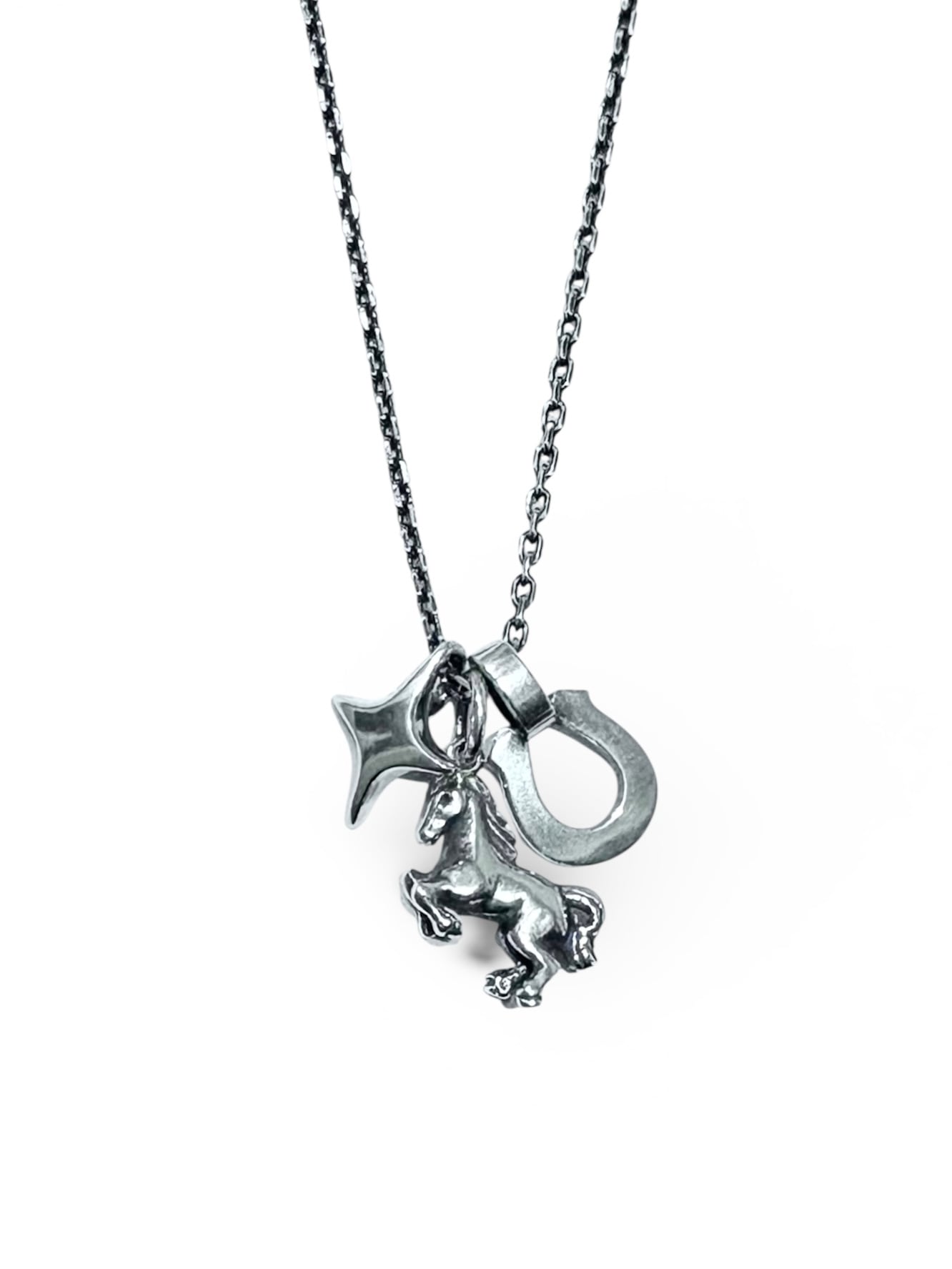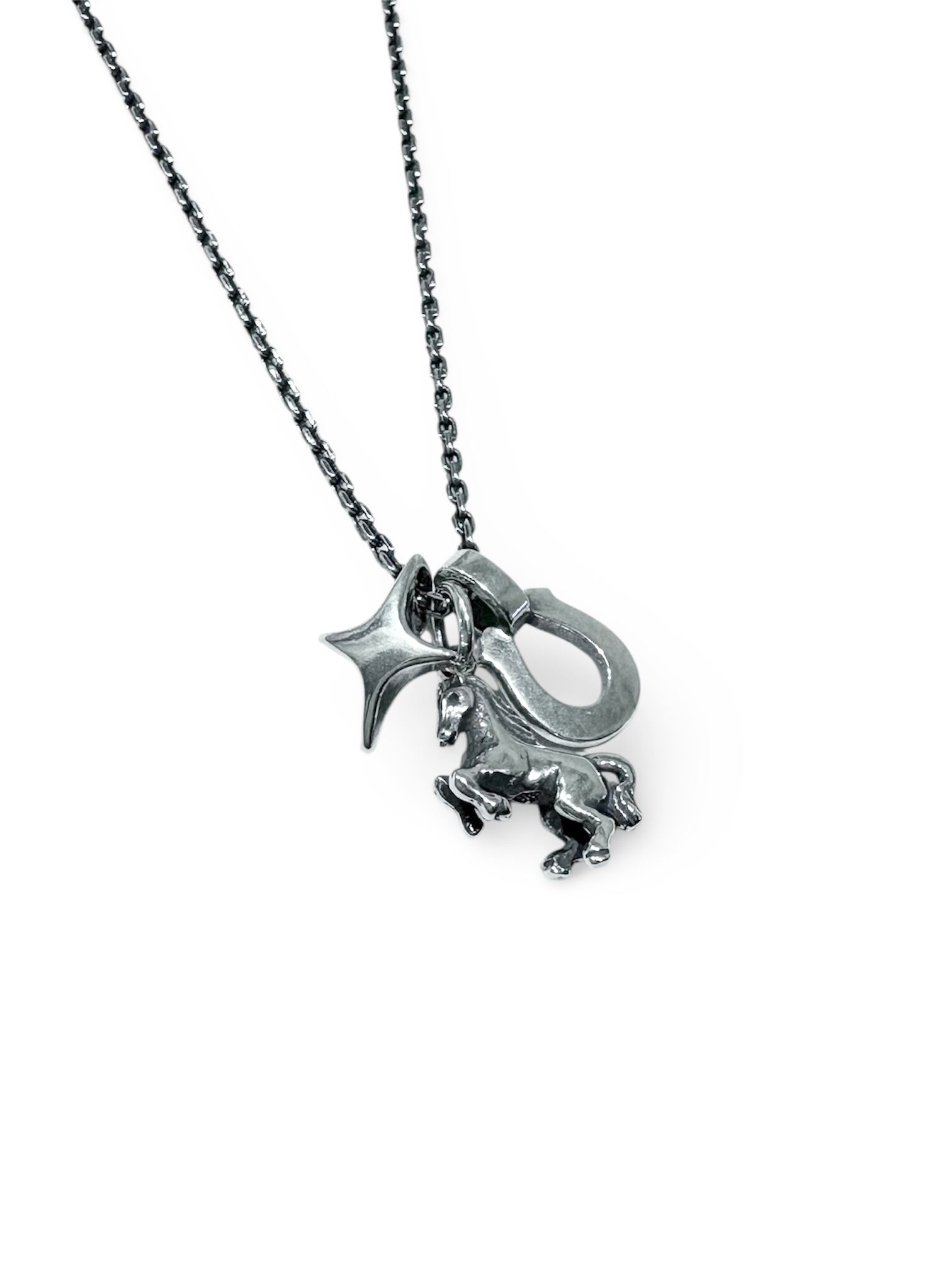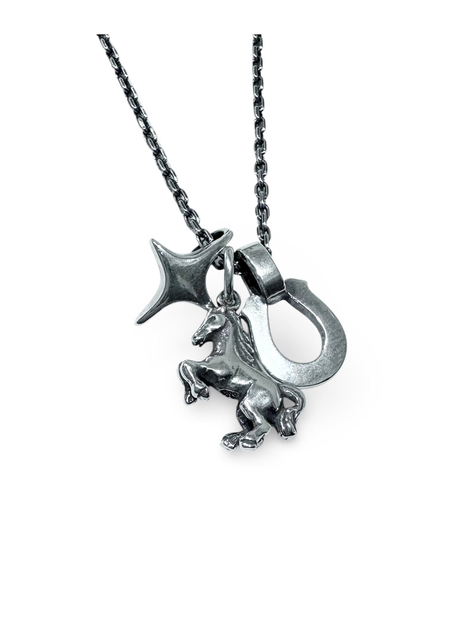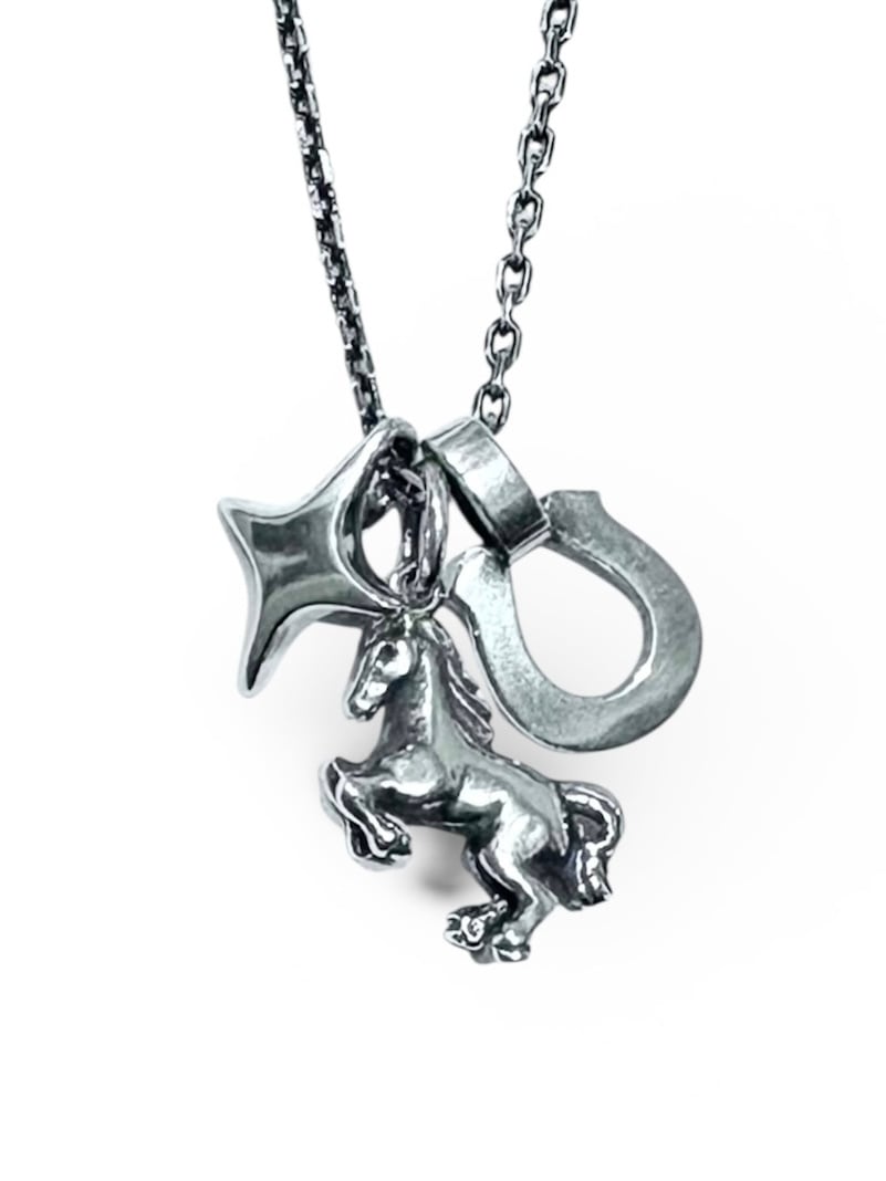 飛躍と運気上昇をもたらす跳ね馬。願いと力を宿した3つのチャームが連なる、豪華なネックレス。