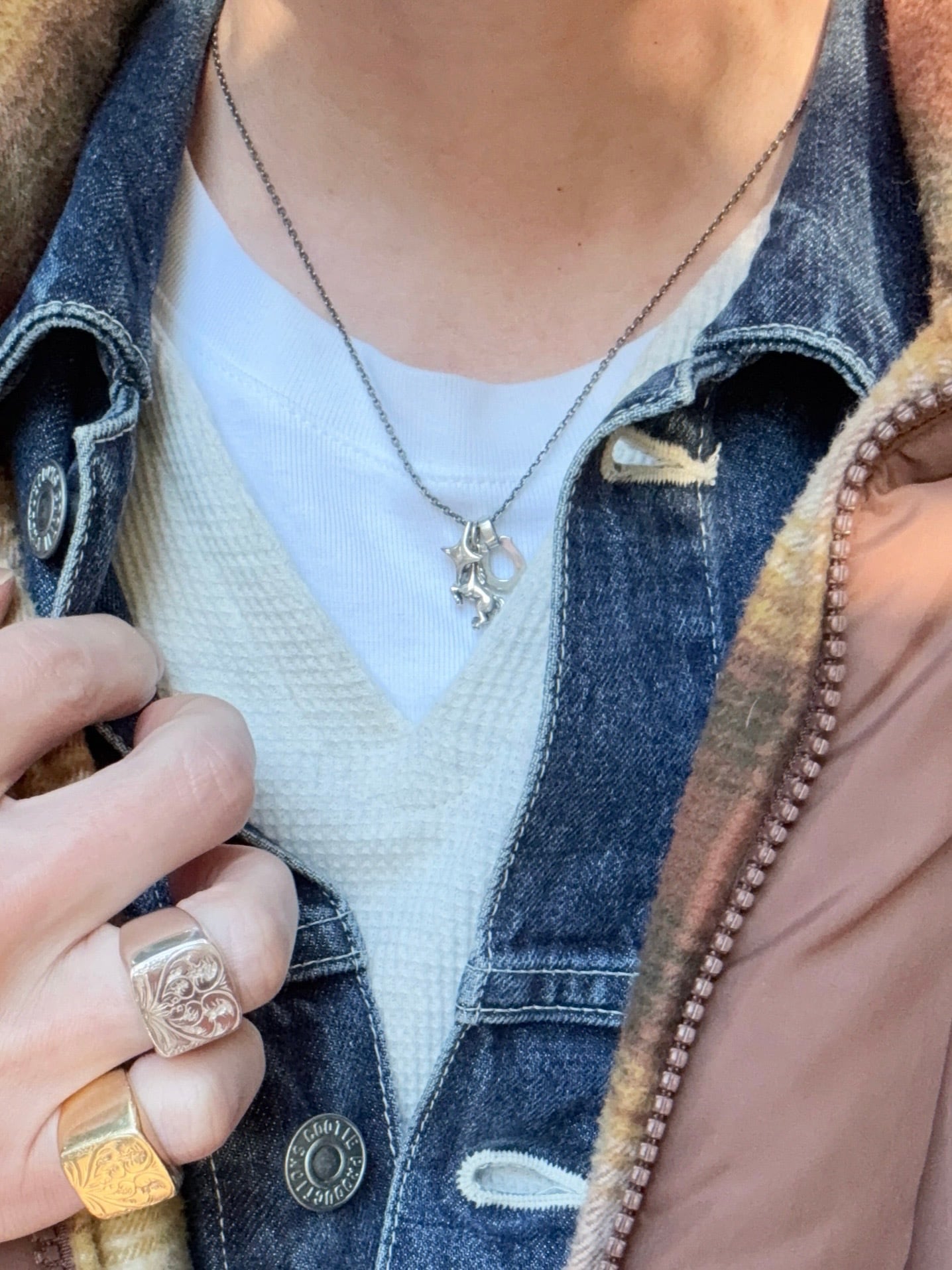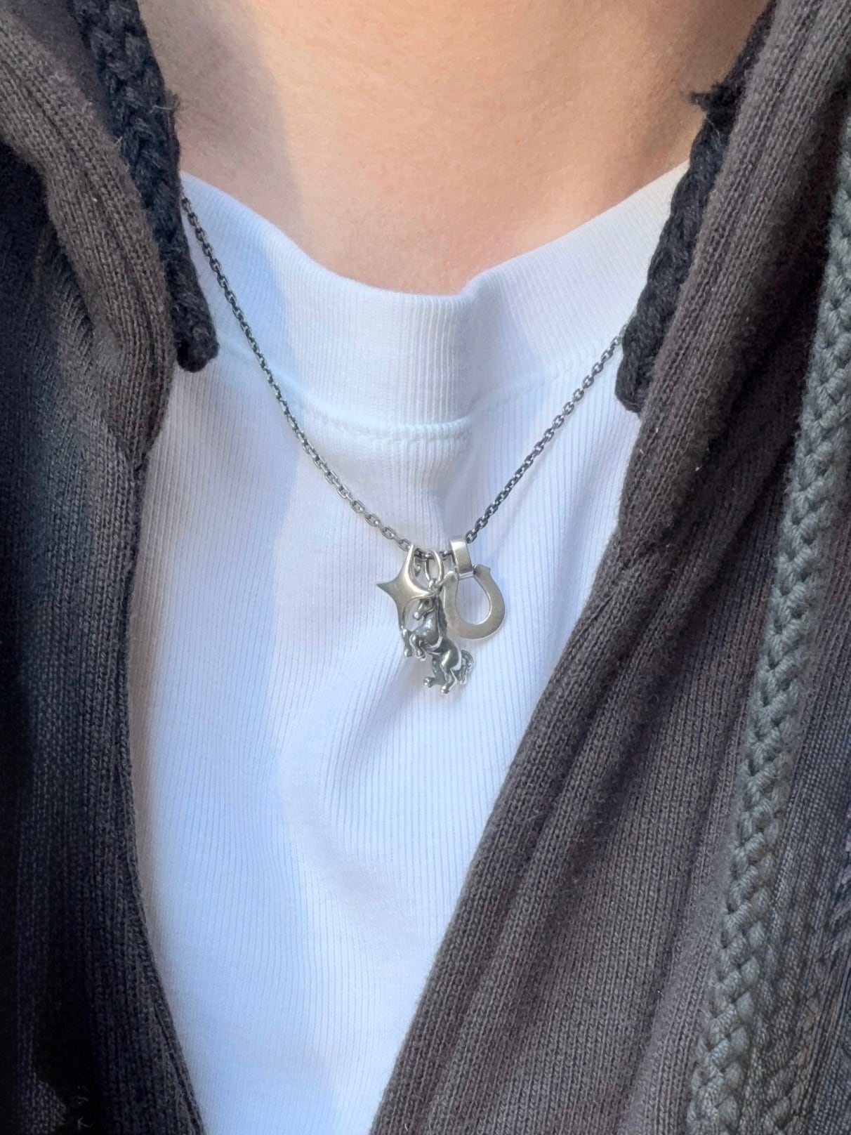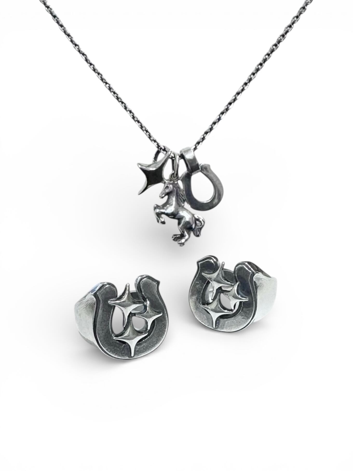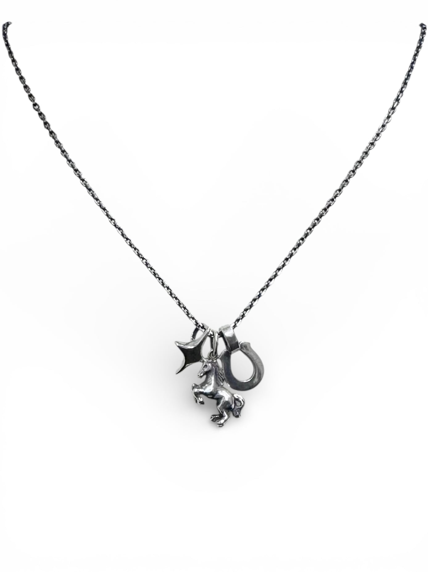 飛躍と運気上昇をもたらす跳ね馬。願いと力を宿した3つのチャームが連なる、豪華なネックレス。